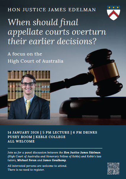 Join us for a panel discussion between the Hon Justice James Edelman (High Court of Australia and Honorary Fellow of Keble) and Keble’s law tutors, Michael Foran and James Goudkamp.